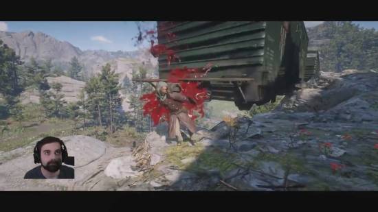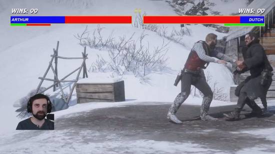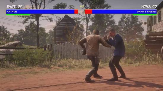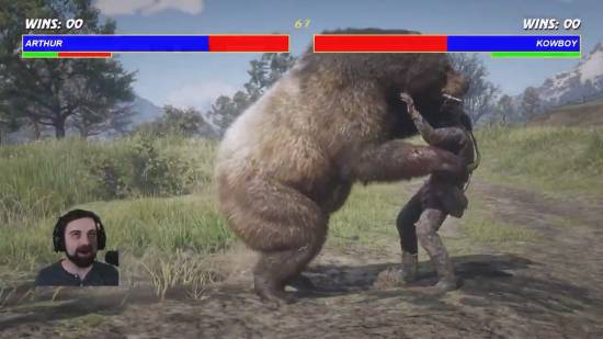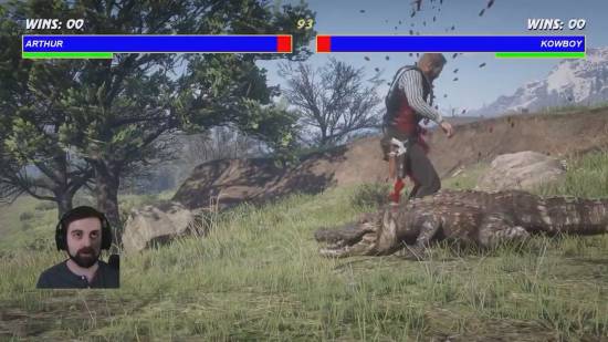 在他的模组中,亚瑟一旦触发拳斗,镜头就会自动切换为经典《真人快打》的横版视角。Blurbs 还加入了生命条、音效、连击系统,甚至还做出了终结技。格斗的对象也不局限于人类,甚至还包括棕熊、鳄鱼这些凶猛野兽。