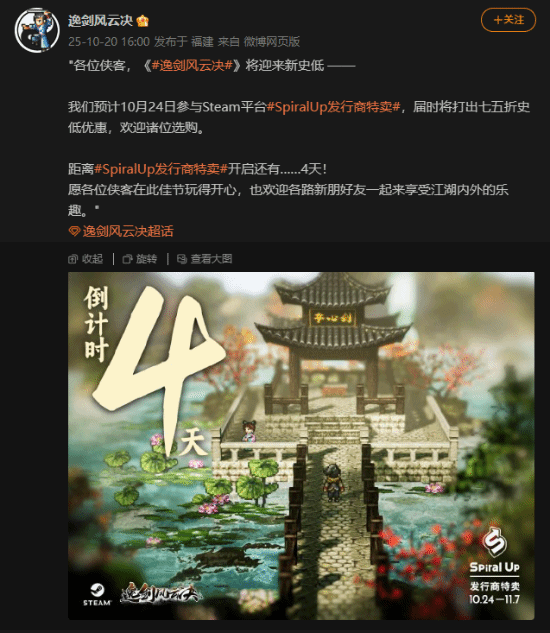 像素武侠RPG《逸剑风云决》官方宣布将于10月24日参与Steam平台SpiralUp发行商特卖,届时将打出七五折史低优惠。