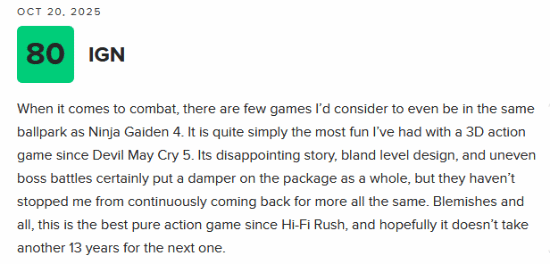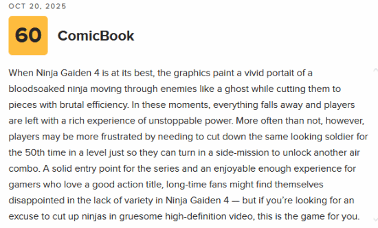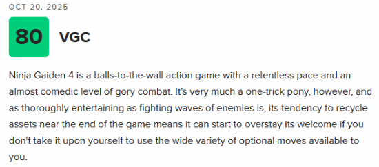 《忍者龙剑传4》是一款“火力全开”的动作游戏,节奏紧凑、战斗血腥得近乎喜剧化。只是它在本质上还是个“单一绝活”的游戏——虽然成群杀敌的快感无比爽快,但到了后期,游戏开始反复利用相同素材,让体验有些疲惫。若你不主动去尝试那些丰富的可选连招动作,这种重复感会更明显。