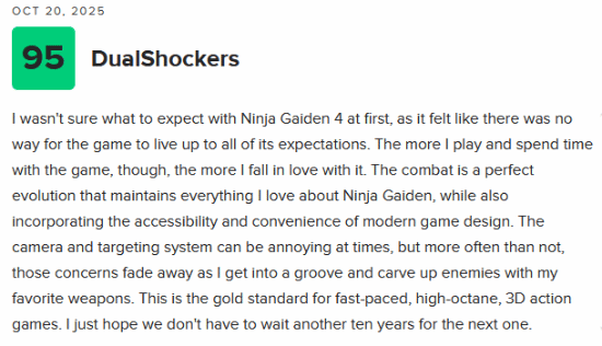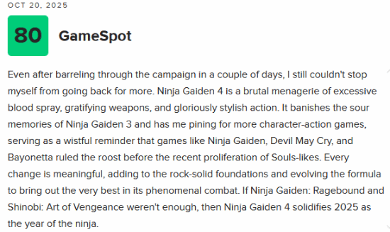 即使我在短短几天内就通关了主线,我依然忍不住想要继续玩下去。《忍者龙剑传4》是一场残酷而华丽的盛宴——夸张的血花、爽快的武器手感、极致的动作美学一应俱全。它一扫《忍者龙剑传3》的阴霾,让我再次渴望更多角色动作游戏,也让我怀念起当年《忍者龙剑传》、《鬼泣》和《猎天使魔女》称霸动作领域的时代。每一处改动都意义重大,它在坚实的基础上进一步进化,将那套惊人的战斗系统发挥到极致。如果说《忍者龙剑传外传:怒之羁绊》和《超级忍 反攻的斩击》还不够的话,那么《忍者龙剑传4》正式让2025年成为“忍者之年”。