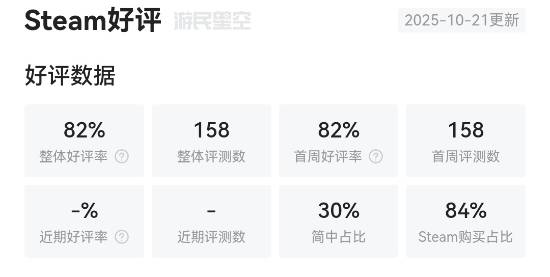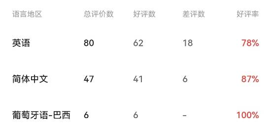 根据数据,本作在Steam上的整体好评率为82%,评价等级为“特别好评”,简中好评率为87%。