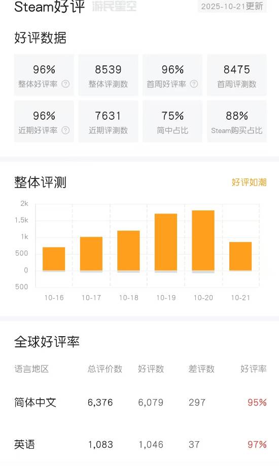 《逃离鸭科夫》于上周正式发售,截至目前,本作在Steam平台获得了“好评如潮”的评价,超过8000条用户评价中,好评率高达96%。
