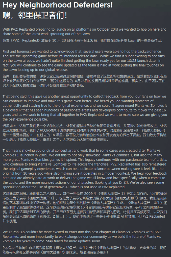 官方表示,他们目前仍在努力为这片“草坪”做最后的修剪与打理。制作团队已经听到了大家在音效、角色动作细节等方面的反馈,团队已经在努力改进,力求带来那个大家熟悉又热爱的版本。同时,团队也注意到外界有关于“游戏是否使用了生成式 AI”的猜测,但在《植物大战僵尸:重植版》中并未使用任何生成式AI技术。