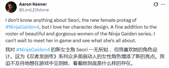 截至发稿前,不少玩家在推特里晒出了Seori的截图,配文不吝赞美之词。有玩家说道:“我对《忍者龙剑传4》的新女主角Seori一无所知,但非常喜欢她的角色设计,她为《忍者龙剑传》系列美女阵容增添了亮眼的一笔,我已经等不及要在游戏中遇见她,看看她究竟是怎样的存在了。”