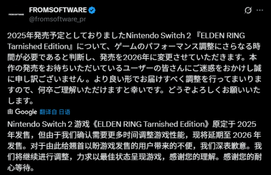 FS社刚刚发布公告,宣布将登陆Switch2的《艾尔登法环 褪色者版》延期至2026年。