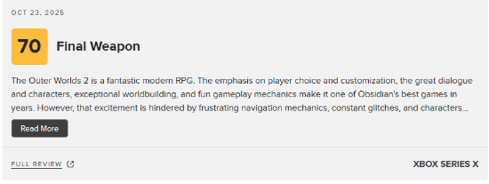 目前游戏的M站媒体评分已经解禁,截至发稿前,共有17家媒体对本作进行评测,媒体均分为85分(XSX版)。(本文持续更新M站评分)