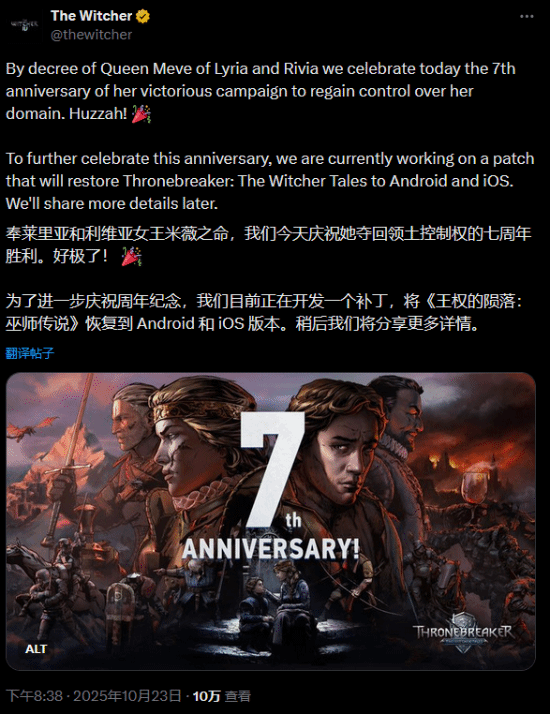 据PlayGround报道,为纪念《巫师之昆特牌:王权的陨落》发售七周年,CD Projekt RED工作室将让本作重新回归移动平台。