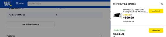 据介绍,美国交易网站Best Buy上已经出现了多台ROG Xbox Ally X的“仅拆(Open Box)”商品,成色等级从“Excellent(极佳)”到“Fair(一般)”不等,最低售价仅为889.99美元(折合约6340.55元人民币),比官方建议零售价便宜了一百多美元(原价999.99美元,国行6499元)。