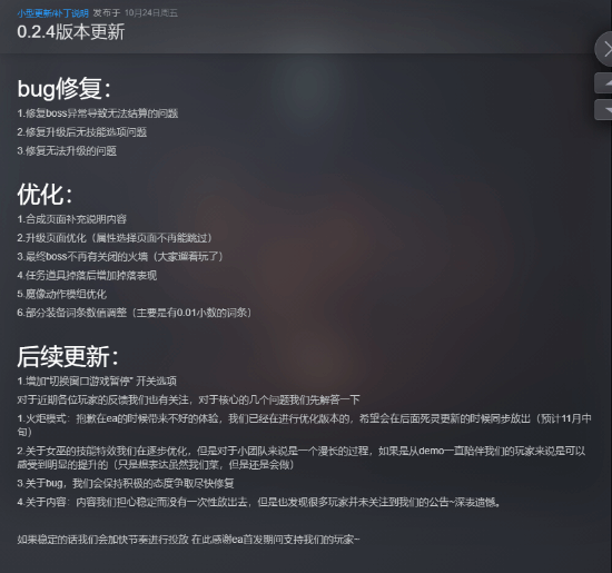 玩家还特别称赞制作组更新积极、响应迅速,部分漏洞问题反馈当天就能修复,显示出团队对社区意见的重视。