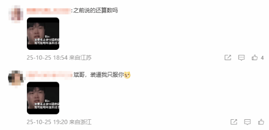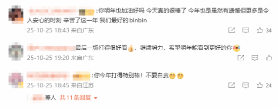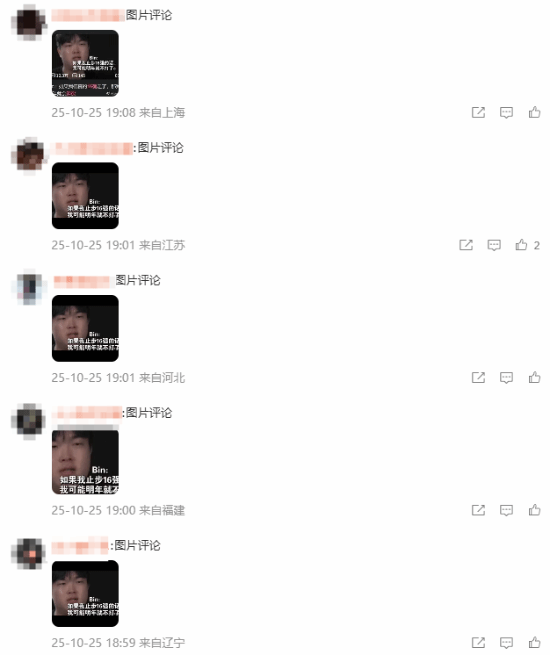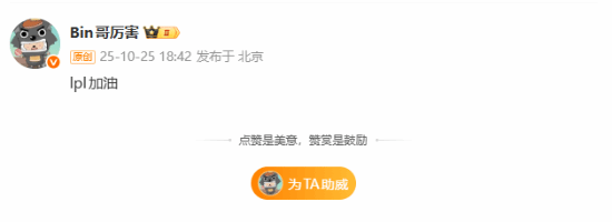 比赛之后,BLG上单选手陈泽彬(游戏ID:Bin)在微博发文说道:“LPL加油。”引来众多网友围观,很多网友拿出了Bin此前的“如果我止步16强的话,我可能明年就不打了”的言论进行了回复,也有网友对Bin进行了安慰。