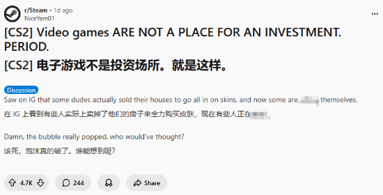 Reddit玩家“NiceYam01”日前发帖,对在《反恐精英2》饰品市场投资的一些玩家进行了吐槽,说道:“电子游戏绝非投资之地,绝不可能。在IG上看到有人居然卖房来全力购买皮肤,现在有些人都崩溃到极点了。哎,泡沫到底还是破了。这谁能想到呢?”