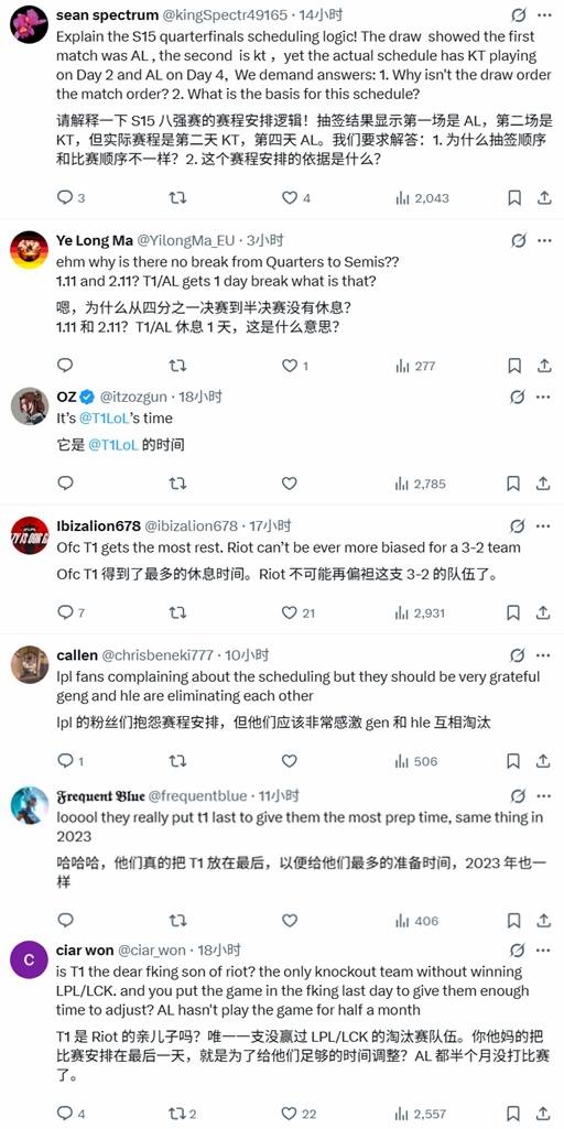 然而,昨天抽签结果一出,拳头官媒评论区直接爆炸,都在讨论又把T1放到最后。#死保T1?拳头官媒遭爆破沦陷#登上贴吧热议榜,吧友热议“是为了让T1尽可能的休息吗?还是因为faker流量大放在最后狂澜流量?”