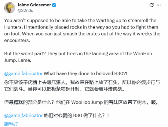 他声称,在该区域,玩家原本“不应该能够驾驶疣猪号(Warthog)上去碾压猎人(Hunters)”。Griesemer透露,他“故意放置了岩石来阻碍,让玩家不得不徒步与它们战斗。” 当被问及不满的原因时,Griesemer直言:“因为我把那里做得对,而他们正在无故地破坏它。”