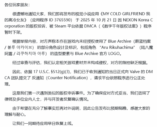 LoveStoryProject已于收到通知的当日正式向V社相关团队提交了反通知,请求平台依照程序进行公正处理,并期待游戏早日恢复上架。