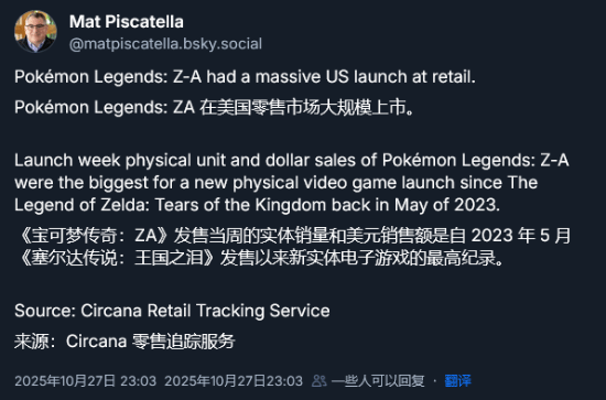 据市场研究机构Circana的分析师Mat Piscatella所分享的信息,《宝可梦传说:Z-A》在美国的零售首发“极其庞大”。虽然不能和2023年的《塞尔达传说:王国之泪》相比(三天售出超过1000万套),但根据宝可梦公司官方公布的数据,本作的首周销量已达580万套,仍然相当亮眼。