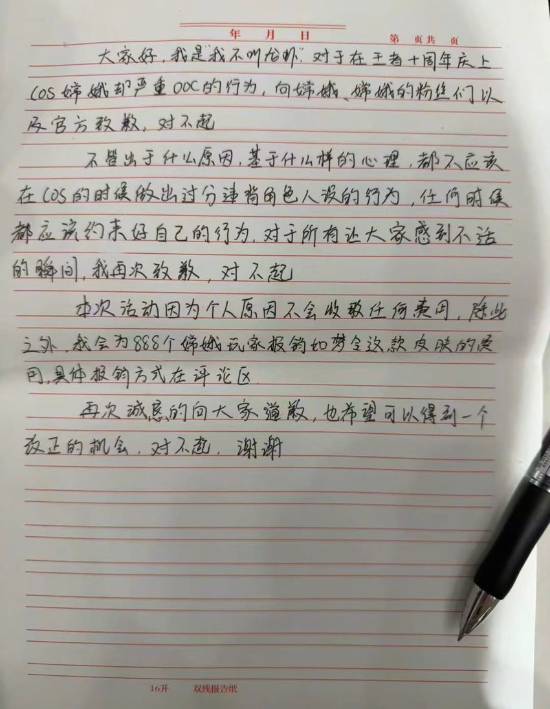 作为补偿,她宣布不收取本次活动的任何费用,并承诺为888名嫦娥玩家报销“如梦令”皮肤,总价约78854元。