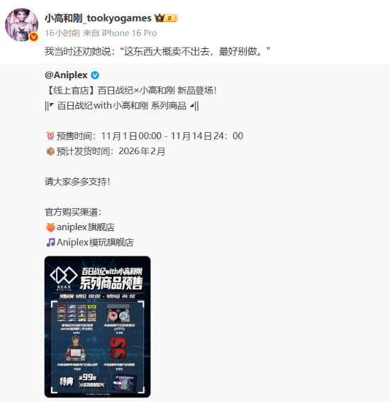 这一将制作人形象直接商品化的独特操作,立刻吸引了本人下场“吐槽”。小高和刚本人转发了相关微博,并配文表示了对周边销量的“担忧”: