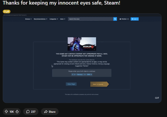 然而,真正让人哭笑不得的是——当这位玩家点击“下一个游戏”时,Steam随即推荐了一款成人向游戏,却没有进行任何年龄验证。对此,该玩家调侃道:“谢谢Steam为我这双纯洁的眼睛保驾护航。”