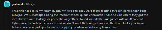 评论区的讨论也十分热烈。有网友分享了类似的尴尬经历:“我那次正和妻子、宝宝一起看游戏,结果屏幕上突然弹出个成人动画,从那以后我就再也不敢点探索队列了。”也有玩家吐槽称完全搞不懂该系统的逻辑,认为过滤器并不有效,并质疑Steam在内容分级与推荐算法上的一致性问题。