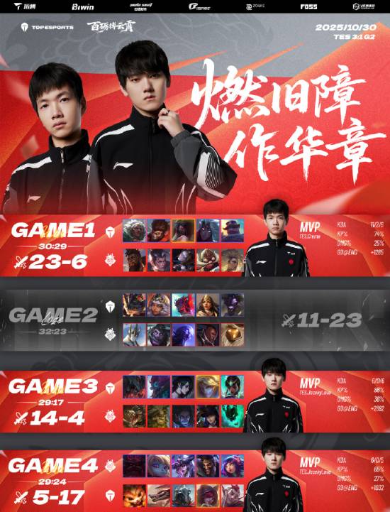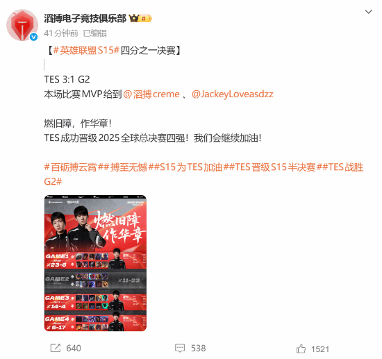 赛后,@滔搏电子竞技俱乐部官方发文庆祝了这一里程碑式的胜利,并向粉丝喊话:“燃旧障,作华章!TES成功晋级2025全球总决赛四强!我们会继续加油!”