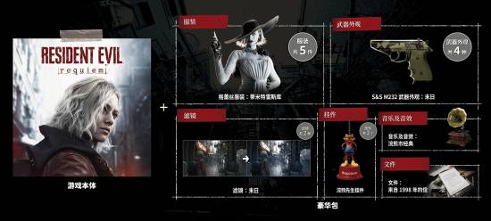 豪华版价格为398元/568港元,除了游戏本体外,还有格蕾丝的“蒂米特雷斯库”等5套服装(有人猜测包含里昂的服装)、“末日”滤镜、2个“浣熊先生”挂件、4种“末日”武器外观、“浣熊市经典”音乐音效、文件“来自1998年的信”等道具。