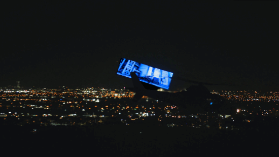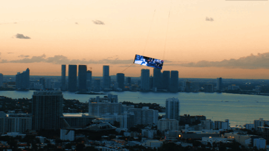 工作人员乘坐直升飞机,看向远处用更高的飞机悬吊着的大屏幕。员工与大屏幕并非相对静止,不仅要持续看着不断变化位置的屏幕,还要看清游戏角色和敌人的动作。再加上高空的恐惧,是一件很难做到的事。