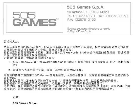 11月1日,B站@505_games发文表示,网上所传的“发行商505 Games与为《明末》做QA的Keywords在打官司,拖欠Keywords公司款项以致未能提交bug”的表述与真实事实不符。