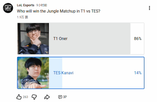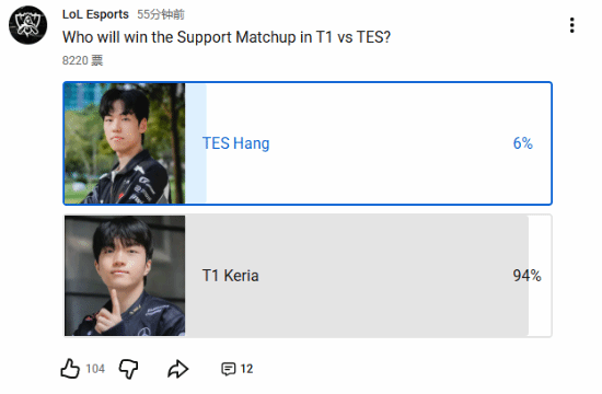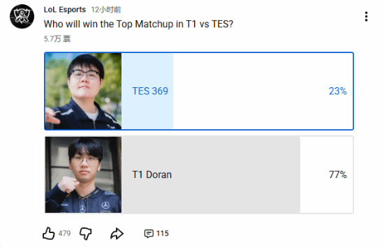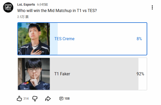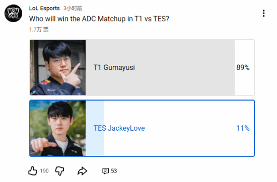 此外,官方还发布了T1和TES对位选手的投票情况,支持率仍然一边倒。
