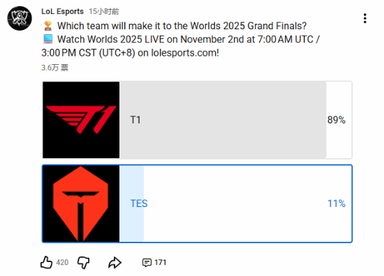 LOL官方昨日发布了T1对阵TES的投票,结果显示89%的玩家认为T1会晋级决赛,只有11%的玩家认为TES能晋级决赛。截至发稿,投票总数已超过3.6万人。