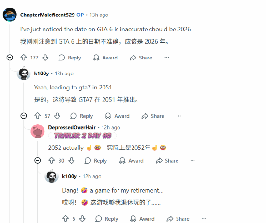 玩家们甚至在评论区更正到,图片日期的不准确性,《GTA6》是2026年推出,也就是说《GTA7》要等到2052年了。