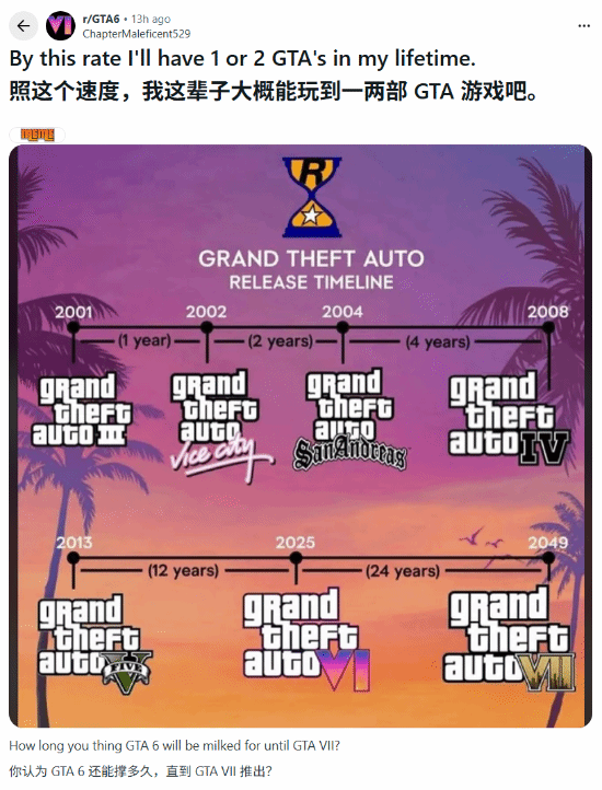 在Reddit论坛,有玩家发文表示,随着R星开发GTA系列游戏的时间越来越长——人这一辈子还能玩到几部GTA游戏呢?