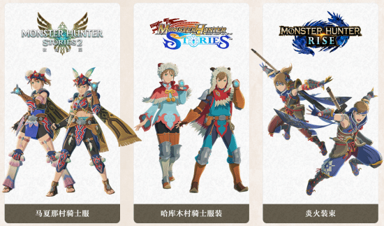 支持存档联动特典的游戏为《怪物猎人物语1》、《怪物猎人物语2》、《怪物猎人:崛起》三款游戏,特典外观分别为马夏那村骑士服、哈库木村骑士服装、炎火装束。