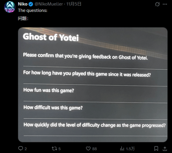 游戏博主@NikoMueller晒出了问卷截图。调查开头写道:“我们希望了解您对最近发售的一款游戏的感受。如果您自《羊蹄山之魂》推出以来玩过本作,请花一点时间填写这份关于您游玩体验的简短调查。”