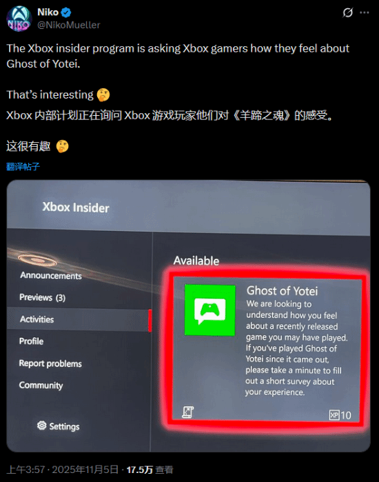 据GamesRadar+报道,过去一段时间,一些Xbox Insider计划成员收到了一份令人意外的调查问卷,内容竟然是关于由Sucker Punch开发、目前仅在PS5平台独占的《羊蹄山之魂》。