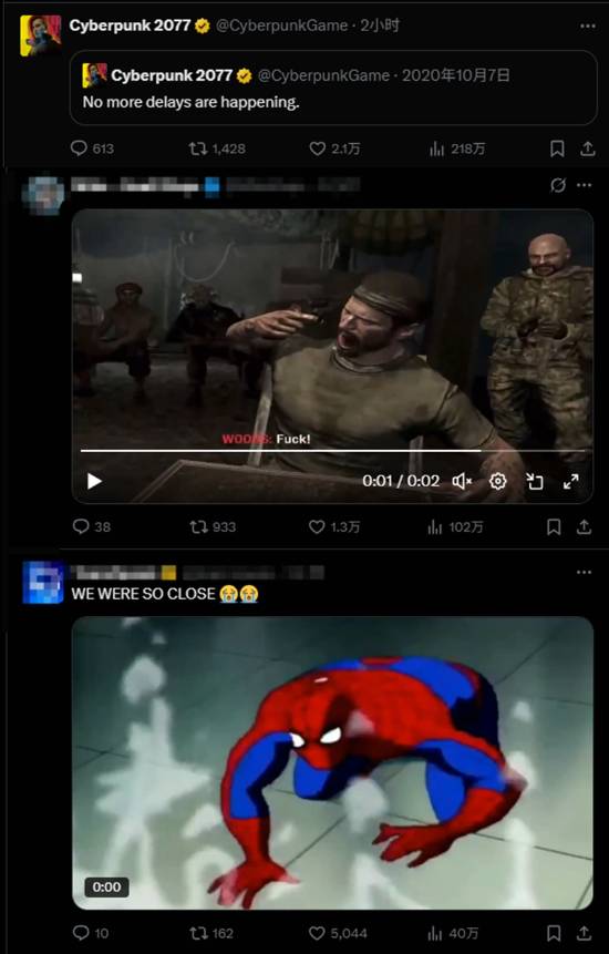R星推特评论区目前可以称得上是哀嚎遍野,连《赛博朋克2077》官方都转发了自己之前的推文来吐槽:“不会再次延期了。”