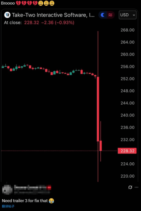 此外还有玩家分享,在R星官宣《GTA6》再次跳票后,R星母公司Take-Two的股票直接一波大跳水!对此玩家们表示,只有发布第三支预告片才能解决这个问题!