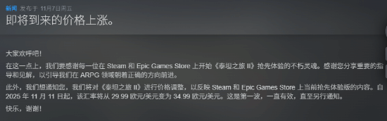 《泰坦之旅2》官方宣布,将根据抢先体验阶段已开放的游戏内容,对《泰坦之旅2》进行价格调整:自2025年11月11日起,游戏售价将由29.99美元调整为34.99美元。这次调整是第一阶段调价,具体截止时间将另行通知。另外,官方此前已确认正式版的价格为49.99美元。