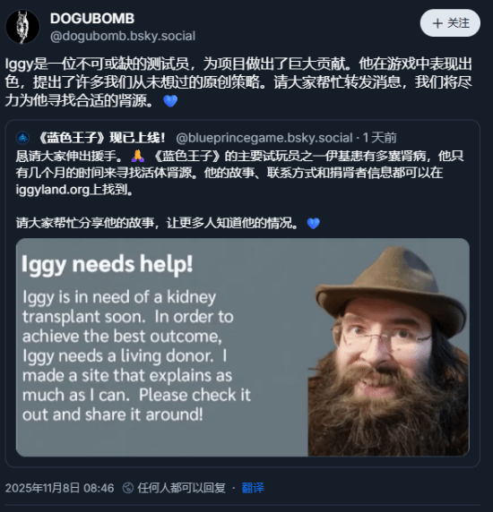 日前,Dogubomb向玩家社区发出求助公告——作为这款游戏核心成员之一的首席测试员 Iggy,因罹患成人型多囊肾病(ADPKD),急需接受活体肾移植才能延续生命。