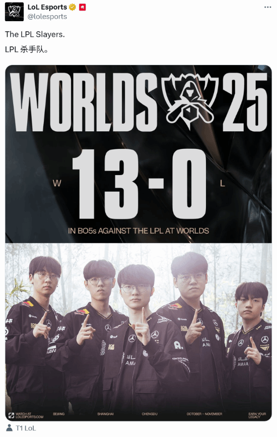 算起来,Faker在S赛BO5中对战LPL的比分已经来到了13:0,从S3开始13年未尝一败,连《英雄联盟》官推都称其为“The LPL Slayers(LPL杀手)”。