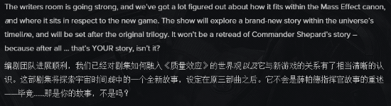 在博客中他表示:“编剧团队目前进展顺利,我们已经搞清楚了这部剧如何融入《质量效应》的正史,以及它在新游戏时间线中的位置。”Gamble写道,“这部剧将探索宇宙时间线中的一个全新故事,设定在原始三部曲之后。它不会重述指挥官薛帕德的故事——毕竟,那是你自己的故事,不是吗?”