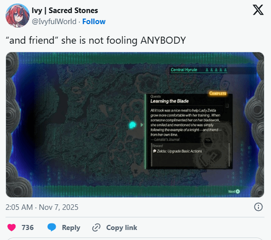 据玩家发现,《封印战记》中的这个任务描述以一份来自莱娜莉亚的日记形式呈现,其中提到塞尔达告诉侍从长,她的剑术是通过"效仿一位来自她同一时代的骑士——也是朋友——的榜样"学来的。一位粉丝表示,“她可糊弄不了任何人”。