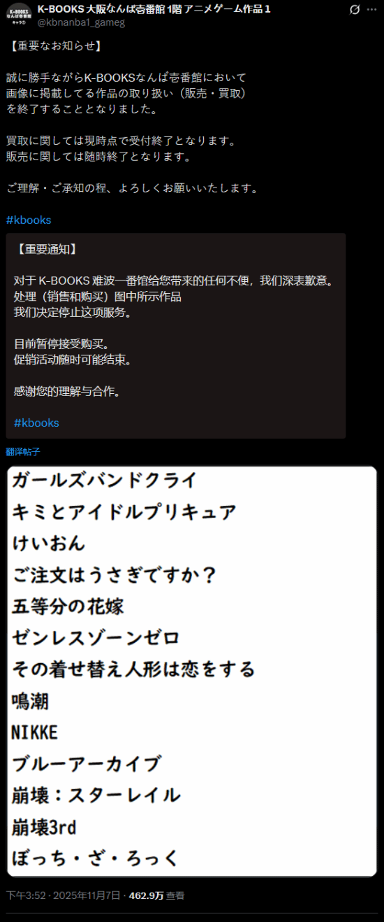 K-BOOKS大阪难波店在其官方账号中列出了十三部将被下架的作品名单,涉及多款热门二次元IP。值得注意的是,目前似乎只有大阪难波实体店会实行这一禁令,全国其他分店暂未受影响。