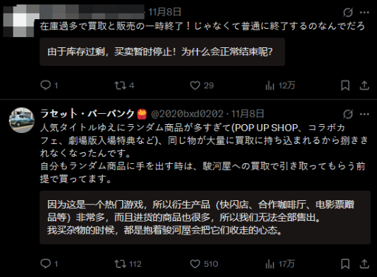 不少日本网友推测,本次停售可能与这类作品衍生出的“盲盒扭蛋式”的周边“谷子”数量过多有关——过度的随机商品不仅造成市场饱和,也加重了玩家与收藏者的经济负担。