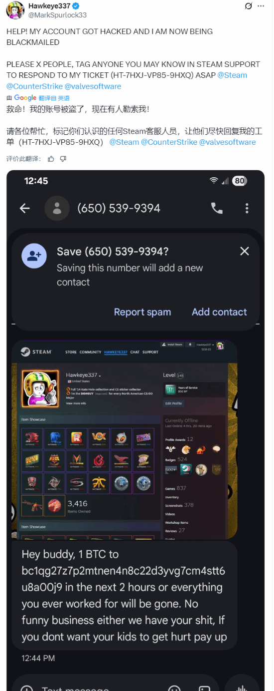 收藏所有者Hawkeye日前在社交媒体公开求助:“救命!我的账号被黑了,现在正在被敲诈!请大家帮我@Steam支持,让他们尽快处理我的请求。”