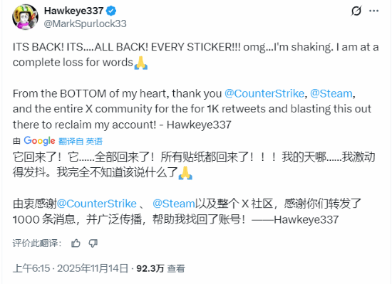 贴纸被恢复在CS历史上几乎从未发生过。Valve过去只有一次类似的“奇迹回档”先例,因此不少人认为Hawkeye的损失不可逆。但数小时后,Valve回档了他账号,并将所有贴纸恢复成原样。Hawkeye激动发文:“我完全说不出话。从心底里感谢你们。”