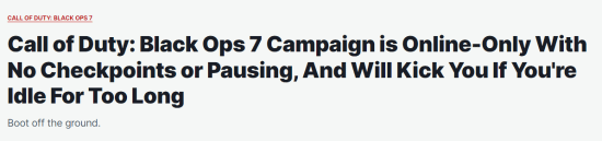 《使命召唤:黑色行动7》已经发售,据IGN报道,游戏的战役模式因其全程联网的设计而受到诸多限制,包括无法暂停关卡,如果你挂机太久还会被系统踢出。