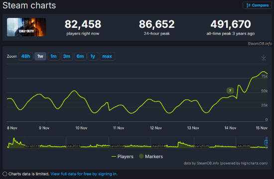 《使命召唤22:黑色行动7》现已正式发售。根据SteamDB数据显示,本作首日在线人数突破8万人(86652),并且仍然呈现上升趋势。