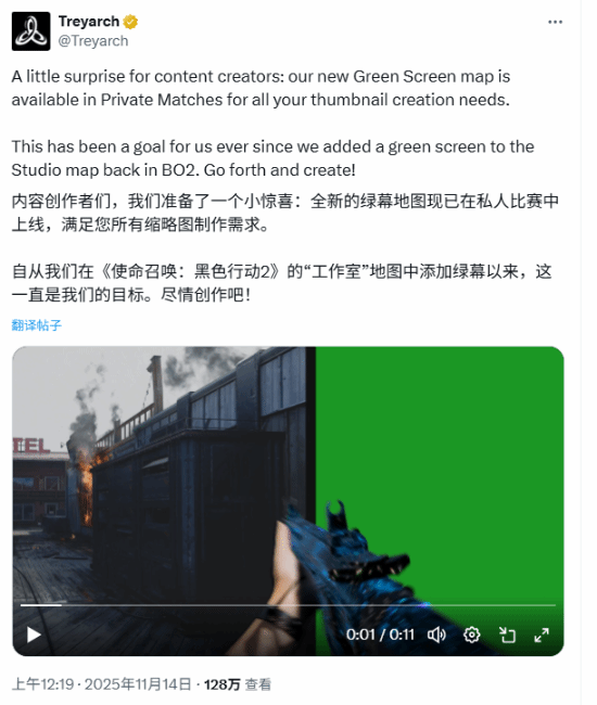 制作组Treyarch昨日在X平台发布了一篇推文,表示《使命召唤22》中已专门为内容创作者们添加了绿幕地图,以方便其进行游戏内容二创。