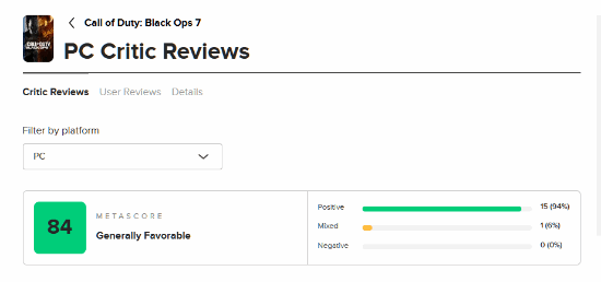 截止至发稿时,《使命召唤22》在M站的媒体均分维持在84分,共有16家媒体给出评测,仅有一条中评,无差评,好评率为94%。