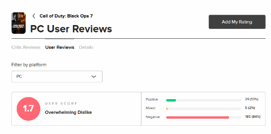 而用户均分为1.7分,219条评测中共有29条好评、5条中评、185条差评,好评率为13%。